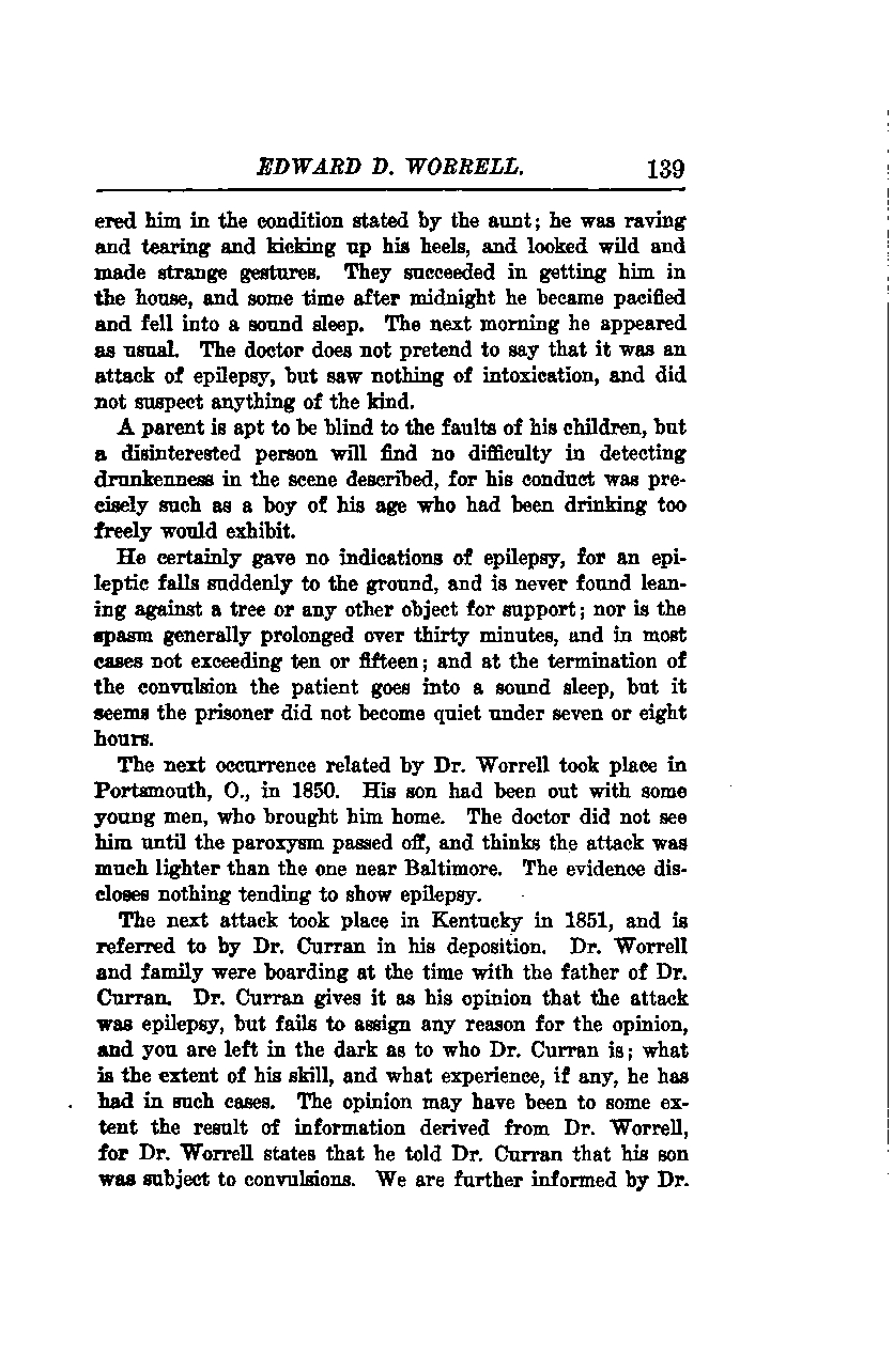 The next attack took place in Kentucky in 1851, and is referred to by Dr. Curran in his deposition. Dr. Worrell and family were boarding at the time with the father of Dr. Curran. Dr. Curran gives it as his opinion that the attack was epilepsy, but fails to assign any reason for the opinion, and you are left in the dark as to who Dr. Curran is, what is the extent of his skill, and what experience, if any, he has had in such cases. The opinion may have been to some extent the result of information derived from Dr. Worrell, for Dr. Worrell states that he told Dr. Curran that his son was subject to convulsions.