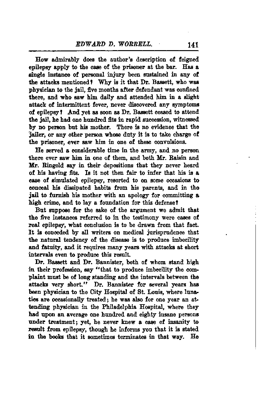 How admirably does the author's description of feigned epilepsy apply to the case of the prisoner at the bar. Has a single instance of personal injury been sustained in any of the attacks mentioned? Why is it that Dr. Bassett, who was physician to the jail five months after the defendant was confined there, and who saw him daily and attended him in a slight attack of intermittent fever, never discovered any symptoms of epilepsy? And yet, as soon as Dr. Bassett ceased to attend the jail, the prisoner had one hundred fits in rapid succession, witnessed by no person but his mother. There is no evidence that the jailer, or any other person whose duty it is to take charge of the prisoner, ever saw him in one of these convulsions.