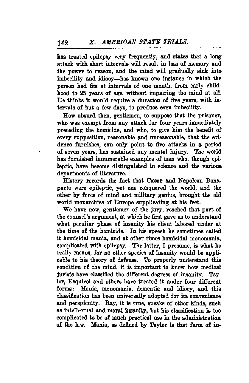 We have now, gentlemen of the jury, reached that part of the counsel’s argument at which he first gave us to understand what peculiar phase of insanity his client labored under at the time of the homicide. In his speech, he sometimes called it homicidal mania, and at other times homicidal monomania, complicated with epilepsy. The latter, I presume, is what he really means, for no other species of insanity would be applicable to his theory of defense. To properly understand this condition of the mind, it is important to know how medical jurists have classified the different degrees of insanity. Taylor, Esquirol, and others have treated it under four different forms: mania, monomania, dementia, and idiocy, and this classification has been universally adopted for its convenience and perspicuity. Ray, it is true, speaks of other kinds, such as intellectual and moral insanity, but his classification is too complicated to be of much practical use in the administration of the law. Mania, as defined by Taylor, is that form of insanity...