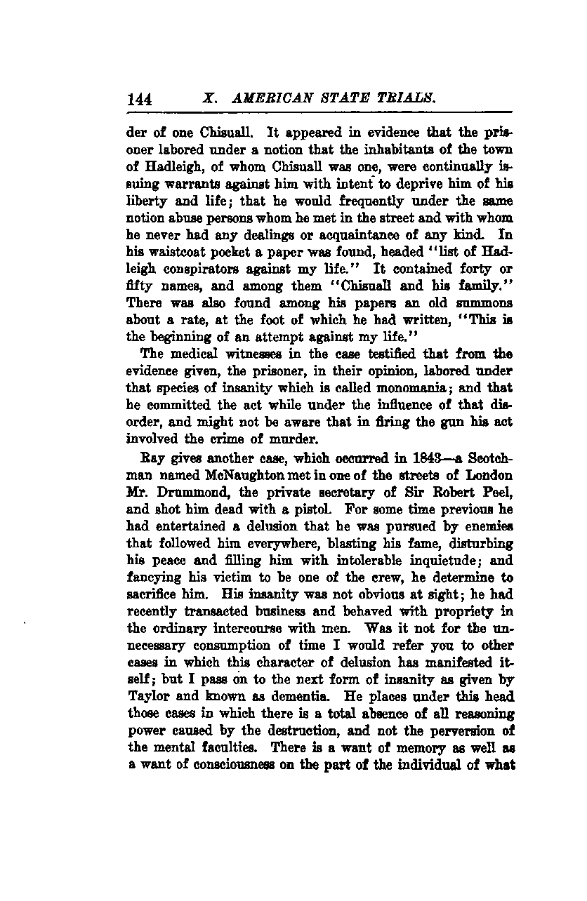 The case involved the murder of one Chisuall. It appeared in evidence that the prisoner labored under the notion that the inhabitants of the town of Hadleigh, of whom Chisuall was one, were continually issuing warrants against him with the intent to deprive him of his liberty and life. He would frequently, under the same notion, abuse persons whom he met in the street and with whom he had never had any dealings or acquaintance of any kind. In his waistcoat pocket, a paper was found, headed "List of Hadleigh conspirators against my life." It contained forty or fifty names, and among them were "Chisuall and his family." There was also found among his papers an old summons about a rate, at the foot of which he had written, "This is the beginning of an attempt against my life."