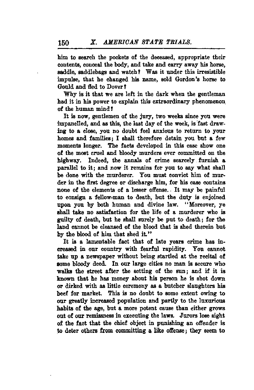 It is now, gentlemen of the jury, two weeks since you were impaneled, and as this, the last day of the week, is fast drawing to a close, you no doubt feel anxious to return to your homes and families. I shall therefore detain you but a few moments longer. The facts developed in this case show one of the most cruel and bloody murders ever committed on the highway. Indeed, the annals of crime scarcely furnish a parallel to it; and now it remains for you to say what shall be done with the murderer. You must convict him of murder in the first degree or discharge him, for his case contains none of the elements of a lesser offense. It may be painful to consign a fellow-man to death, but the duty is enjoined upon you by both human and divine law. "Moreover, ye shall take no satisfaction for the life of a murderer who is guilty of death, but he shall surely be put to death; for the land cannot be cleansed of the blood that is shed therein but by the blood of him that shed it."