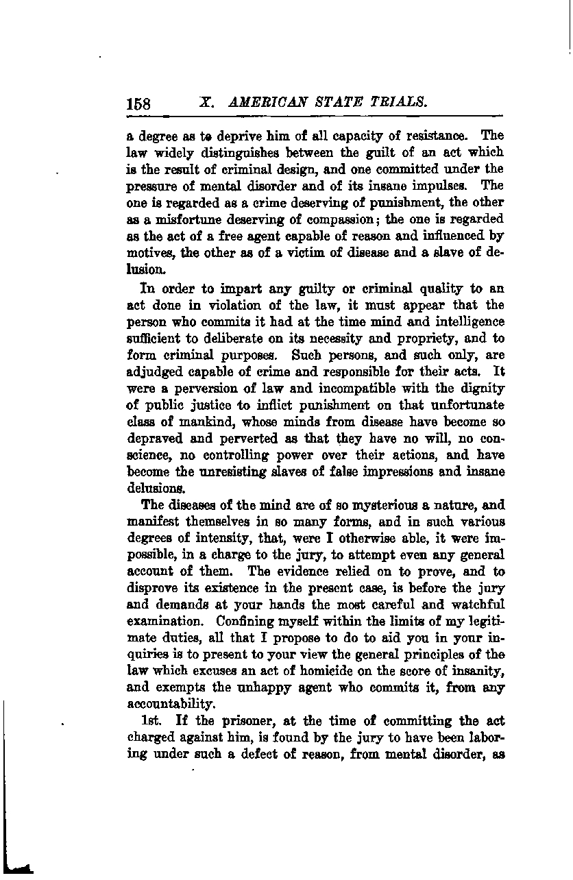 The diseases of the mind are of such a mysterious nature and manifest themselves in so many forms and in such various degrees of intensity that, even if I were otherwise able, it would be impossible in a charge to the jury to attempt even a general account of them. The evidence relied upon to prove and disprove its existence in the present case is before the jury and demands your most careful and watchful examination. Confining myself within the limits of my legitimate duties, all that I propose to do to aid you in your inquiries is to present to your view the general principles of the law which excuse an act of homicide on the grounds of insanity and exempt the unhappy agent who commits it from any accountability.