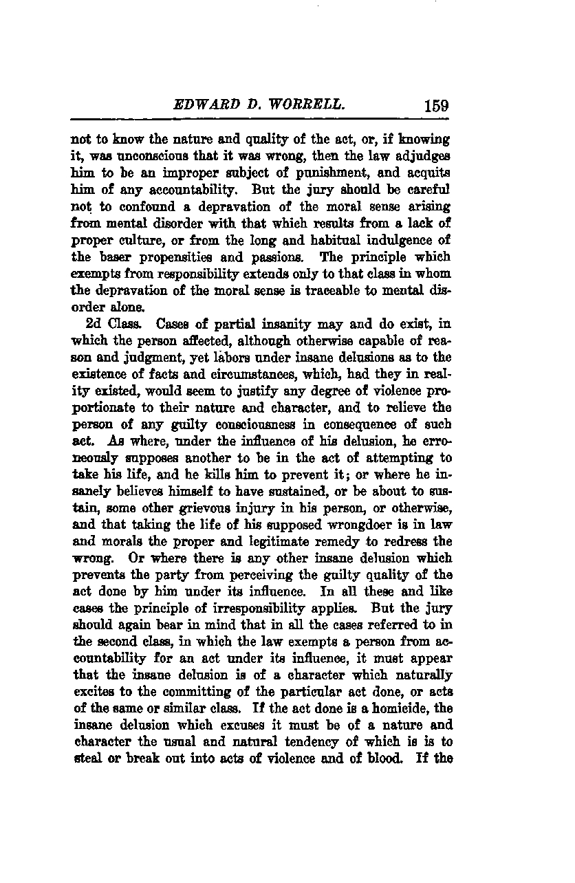 If an individual does not know the nature and quality of the act, or, if knowing it, is unconscious that it was wrong, then the law adjudges him to be an improper subject of punishment and acquits him of any accountability. However, the jury should be careful not to confuse a depravation of the moral sense arising from mental disorder with that which results from a lack of proper culture, or from the long and habitual indulgence of the baser propensities and passions. The principle which exempts from responsibility extends only to that class in whom the depravation of the moral sense is traceable to mental disorder alone.