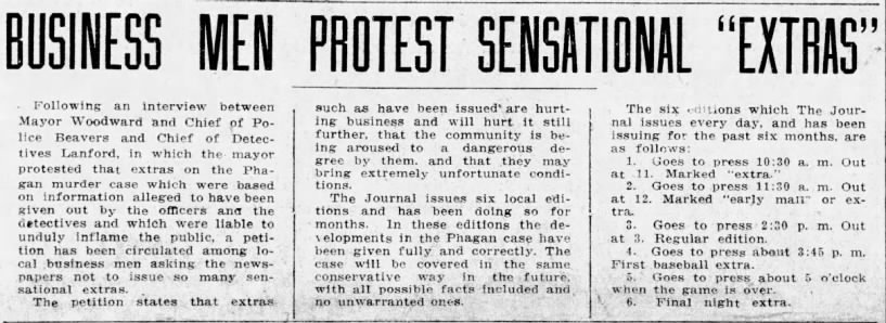 Following an interview between Mayor Woodward and Chief of Police Beavers and Chief of Detectives Lanford, in which the mayor protested that extras on the Phagan murder case which were based on information alleged to have been given out by the officers and the detectives and which were liable to unduly inflame the public, a petition has been circulated among local business men asking the newspapers not to issue so many sensational extras.