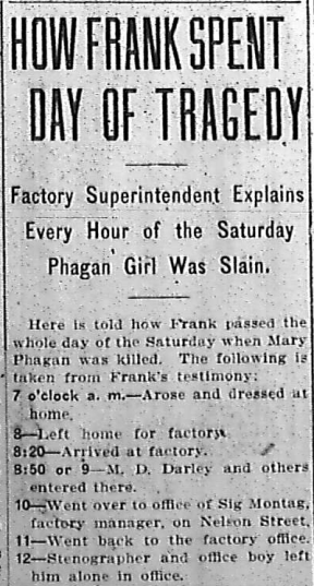 Here is told how Frank passed the whole day of the Saturday when Mary Phagan was killed. The following is taken from Frank's testimony: