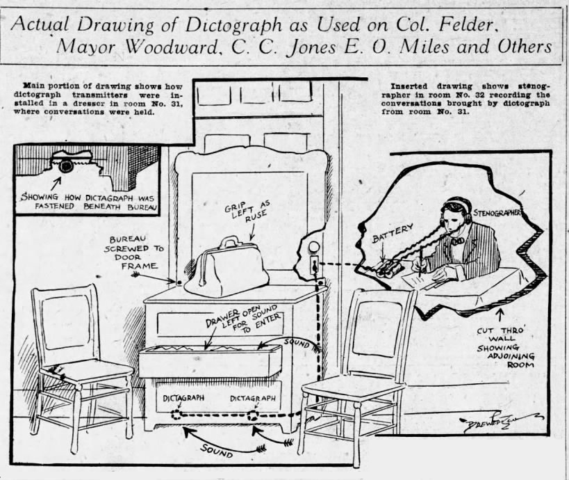 That Mayor James G. Woodward was dictographed by the city detectives on Wednesday afternoon, shortly after Colonel Thomas B. Felder had concluded his interview in Room 31 of Williams House No. 2, 34-36 North Forsyth street, was made public Saturday morning by Chief of Detectives N. A. Lanford.