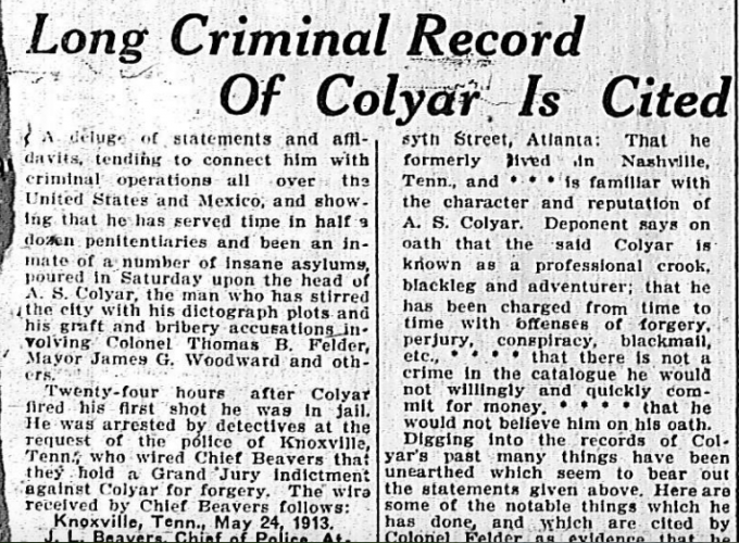 A deluge of statements and affidavits tending to connect him with criminal operations all over the United States and Mexico, and showing that he has served time in half a dozen penitentiaries and been an inmate of a number of insane asylums, poured in Saturday upon the head of A. S. Colyar, the man who has stirred the city with his dictograph plots and his graft and bribery accusations involving Colonel Thomas B. Felder, Mayor James G. Woodward and others.
