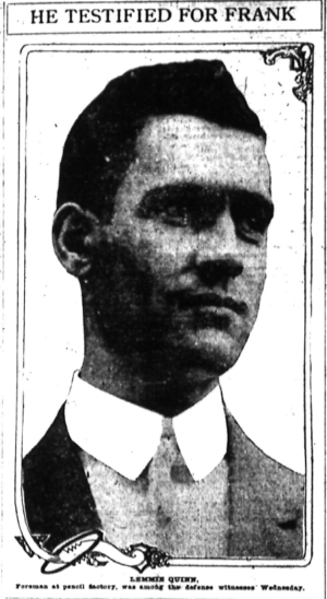 The defense scored an important point Wednesday, when Lemmie Quinn, a factory foreman, declared that he saw Frank in his office, writing at 12:30, almost the exact time that the state claims Frank killed Mary Phagan. Quinn was still on the witness stand, when court adjourned for the noon recess, and the indications were that the completion of his direct and cross-examination would occupy an hour and possibly two hours of the afternoon.