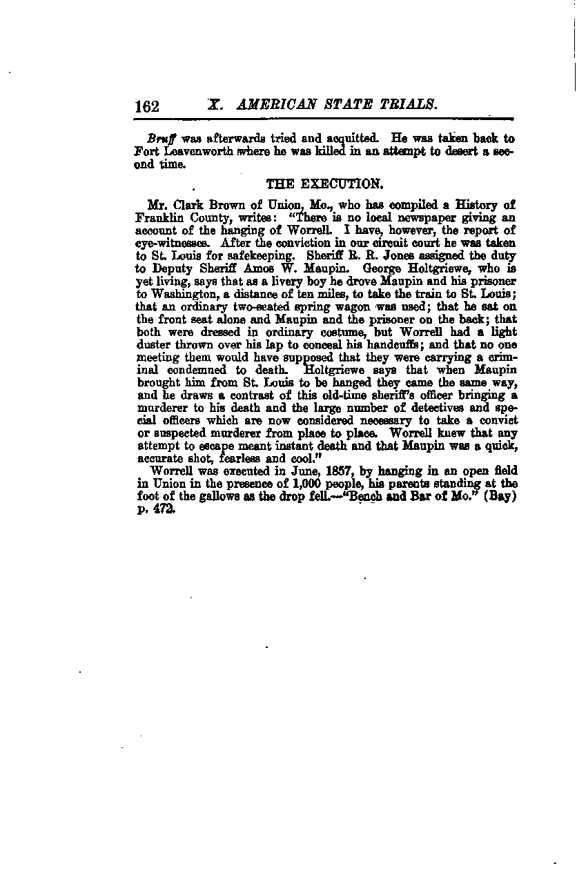 Mr. Clark Brown of Union, Mo., who has compiled a History of Franklin County, writes: "There is no local newspaper giving an account of the hanging of Worrell. However, I have the report of eyewitnesses. After the conviction in our circuit court, he was taken to St. Louis for safekeeping. Sheriff R. R. Jones assigned the duty to Deputy Sheriff Amos W. Maupin. George Holtgriewe, who is still living, says that as a livery boy, he drove Maupin and his prisoner to Washington, a distance of ten miles, to take the train to St. Louis. An ordinary two-seated spring wagon was used; he sat on the front seat alone, and Maupin and the prisoner sat on the back. Both were dressed in ordinary costume, but Worrell had a light duster thrown over his lap to conceal his handcuffs. No one meeting them would have suspected that they were carrying a criminal condemned to death. Holtgriewe says that when Maupin brought him from St. Louis to be hanged, they came the same way. He draws a contrast between this old-time sheriff's officer bringing a murderer to his death and the large number of detectives and special officers which are now considered necessary to take a convict or suspected murderer from place to place. Worrell knew that any attempt to escape meant instant death and that Maupin was a quick, accurate shot, fearless and cool."