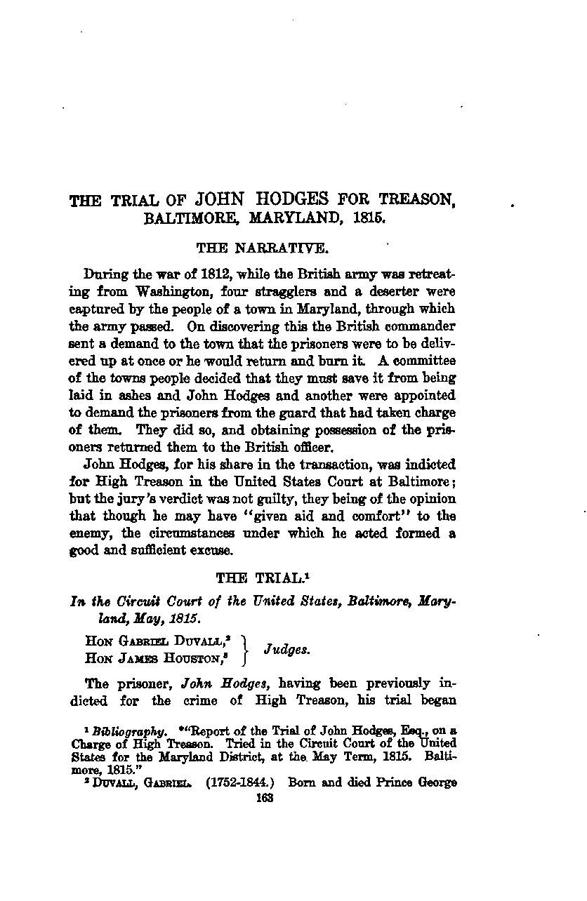 "Report of the Trial of John Hodges, Esq. on a Charge of High Treason. Tried in the Circuit Court of the United States for the Maryland District, at the May Term, 1815. Baltimore, 1815."