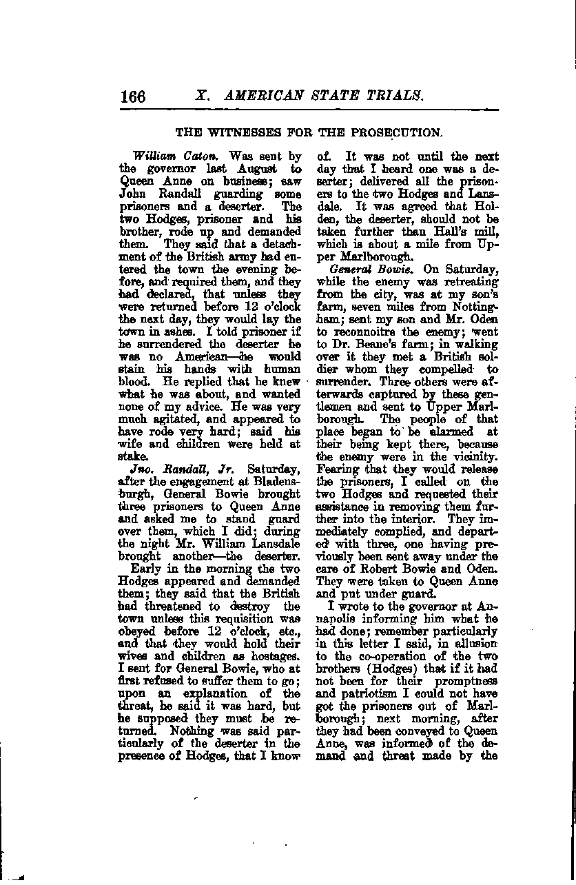 On Saturday, after the engagement at Bladensburg, General Bowie brought three prisoners to Queen Anne and asked me to stand guard over them, which I did. During the night, Mr. William Lansdale brought another—the deserter. Early in the morning, the two Hodges appeared and demanded the prisoners; they said that the British had threatened to destroy the town unless this requisition was obeyed before 12 o'clock, etc., and that they would hold their wives and children as hostages. I sent for General Bowie, who at first refused to let them go; upon an explanation of the threat, he said it was hard, but he supposed they must be returned. Nothing was said particularly of the deserter in the presence of Hodges, that I know of. It was not until the next day that I heard one was a deserter; I delivered all the prisoners to the two Hodges and Lansdale. It was agreed that Holden, the deserter, should not be taken further than Hall's mill, which is about a mile from Upper Marlborough.