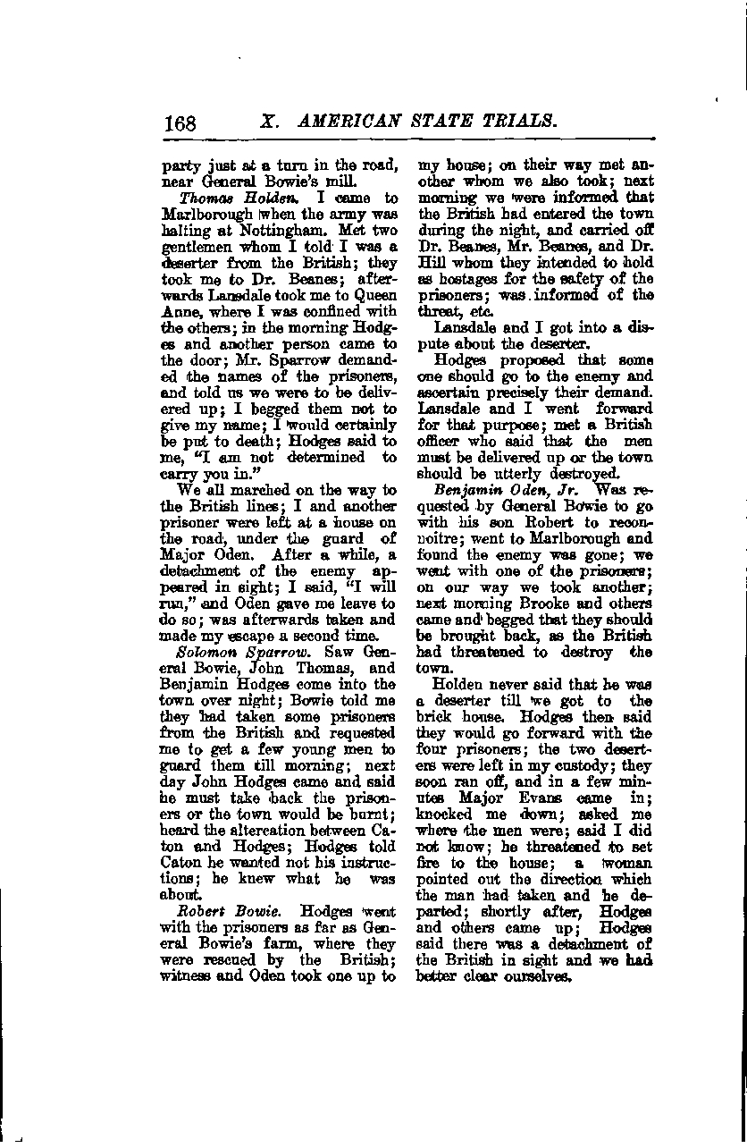Thomas Holden: I came to Marlborough when the army was halting at Nottingham. I met two gentlemen whom I told I was a deserter from the British; they took me to Dr. Beanes. Afterwards, Lansdale took me to Queen Anne, where I was confined with the others. In the morning, Hodges and another person came to the door. Mr. Sparrow demanded the names of the prisoners and told us we were to be delivered up. I begged them not to give my name; I would certainly be put to death. Hodges said to me, "I am not determined to carry you in."