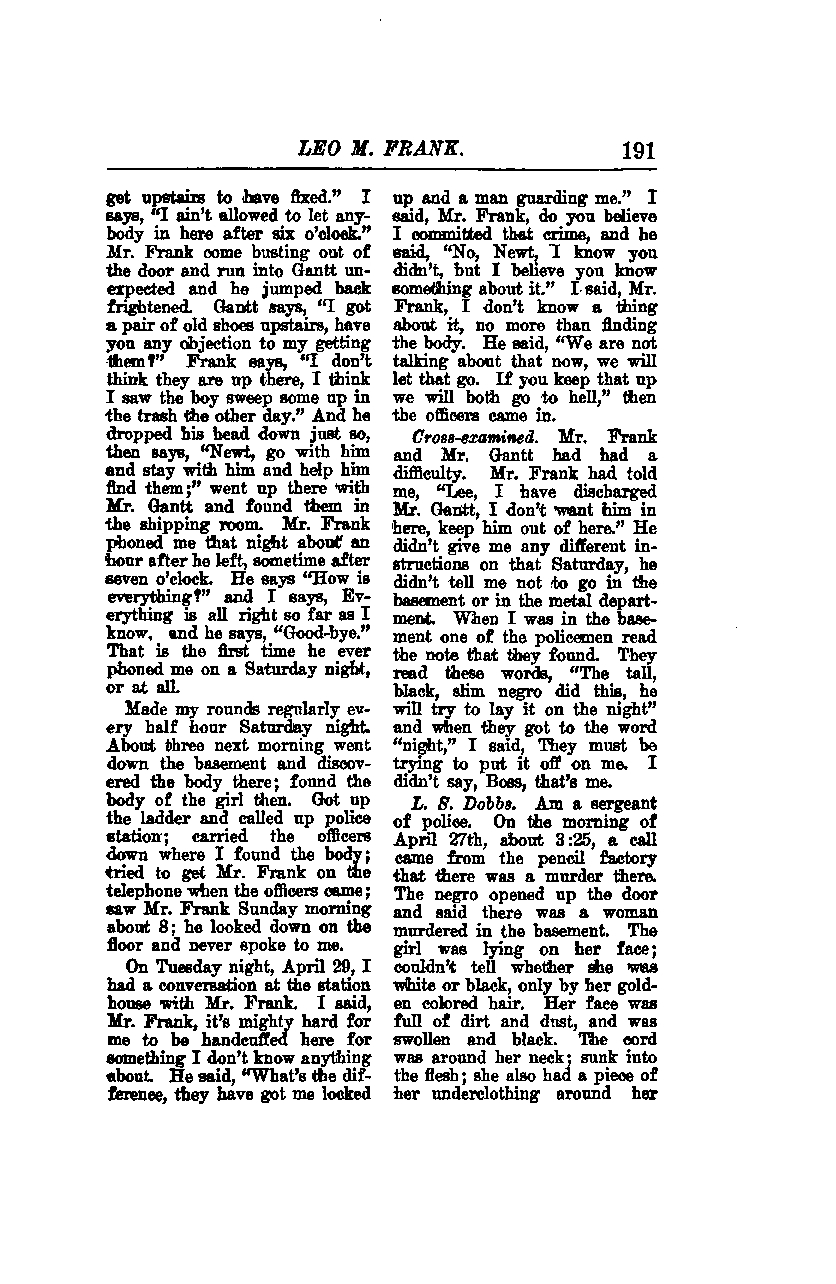 On Tuesday night, April 29, I had a conversation at the station house with Mr. Frank. I said, "Mr. Frank, it's mighty hard for me to be handcuffed here for something I don't know anything about." He said, "What's the difference, they have got me locked up and a man guarding me." I said, "Mr. Frank, do you believe I committed that crime?" and he said, "No, Newt, I know you didn't, but I believe you know something about it." I said, "Mr. Frank, I don't know a thing about it, no more than finding the body." He said, "We are not talking about that now, we will let that go. If you keep that up, we will both go to hell," then the officers came in.