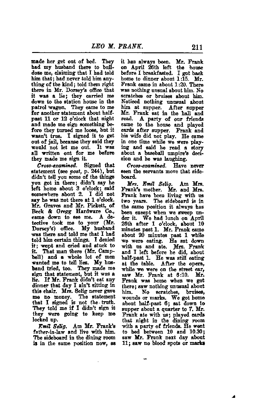 I signed that statement (see post, p. 244), but I didn't tell you some of the things you got in there. I didn't say he left home about 3 o'clock; I said somewhere about 2. I did not say he was not there at 1 o'clock. Mr. Graves and Mr. Pickett, of Beck & Gregg Hardware Co., came down to see me. A detective took me to your (Mr. Dorsey's) office. My husband was there and told me that I had told him certain things. I denied it; wept and cried and stuck to it. That man there (Mr. Campbell) and a whole lot of men wanted me to tell lies. My husband tried, too. They made me sign that statement, but it was a lie. If Mr. Frank didn't eat any dinner that day, I ain't sitting in this chair. Mrs. Selig never gave me any money. The statement that I signed is not the truth. They told me if I didn't sign it, they were going to keep me locked up.