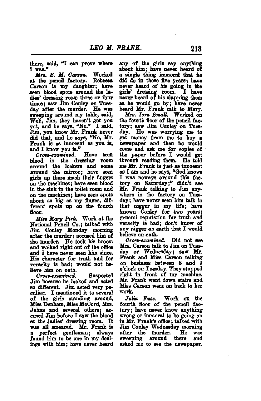 I worked at the pencil factory. Rebecca Carson is my daughter. I have seen blood spots around the ladies' dressing room three or four times. I saw Jim Conley on Tuesday after the murder. He was sweeping around my table. I said, "Well, Jim, they haven't got you yet," and he said, "No." I said, "Jim, you know Mr. Frank never did that," and he said, "No, Mr. Frank is as innocent as you are, and I know you are."