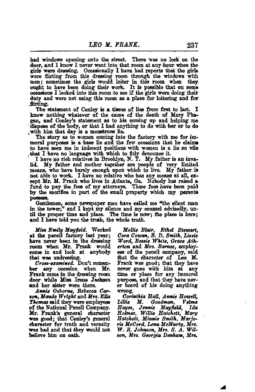 The statement of Conley is a tissue of lies from first to last. I know nothing whatever of the cause of the death of Mary Phagan, and Conley’s statement as to his coming up and helping me dispose of the body, or that I had anything to do with her or with him that day, is a monstrous lie.