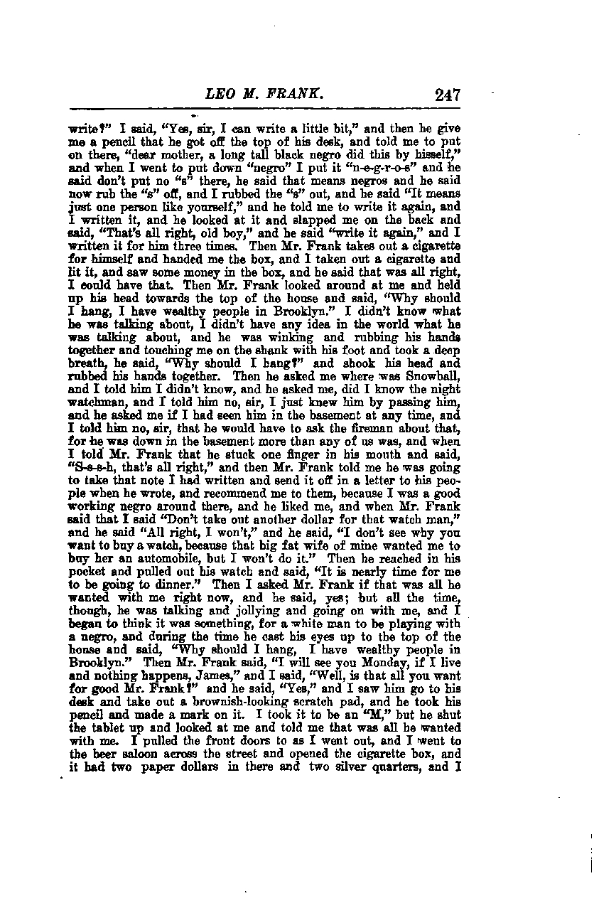 Then Mr. Frank said, "I will see you Monday, if I live and nothing happens, James," and I said, "Well, is that all you want, good Mr. Frank?" and he said, "Yes," and I saw him go to his desk and take out a brownish-looking scratch pad, and he took his pencil and made a mark on it. I took it to be an "M," but he shut the tablet up and looked at me and told me that was all he wanted with me. I pulled the front doors to as I went out, and I went to the beer saloon across the street and opened the cigarette box, and it had two paper dollars in there and two silver quarters, and I...