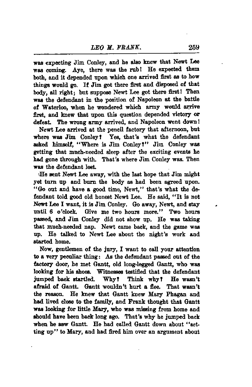 Now, gentlemen of the jury, I want to call your attention to a very peculiar thing: As the defendant passed out of the factory door, he met Gantt, old long-legged Gantt, who was looking for his shoes. Witnesses testified that the defendant jumped back, startled. Why? Think why! He wasn’t afraid of Gantt. Gantt wouldn’t hurt a fly. That wasn’t the reason. He knew that Gantt knew Mary Phagan and had lived close to the family, and Frank thought that Gantt was looking for little Mary, who was missing from home and should have been back long ago. That’s why he jumped back when he saw Gantt. He had called Gantt down about "setting up" to Mary, and had fired him over an argument about it.