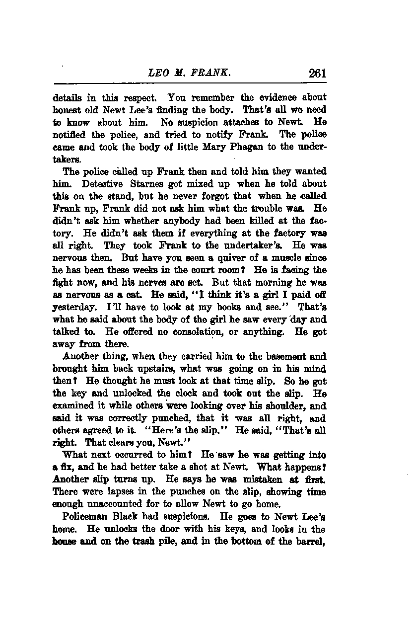 The police then called up Frank and told him they wanted him. Detective Starnes got mixed up when he told about this on the stand, but he never forgot that when he called Frank up, Frank did not ask him what the trouble was. He didn't ask him whether anybody had been killed at the factory. He didn't ask them if everything at the factory was all right. They took Frank to the undertaker's. He was nervous then. But have you seen a quiver of a muscle since he has been these weeks in the courtroom? He is facing the fight now, and his nerves are set. But that morning he was as nervous as a cat. He said, "I think it's a girl I paid off yesterday. I'll have to look at my books and see." That's what he said about the body of the girl he saw every day and talked to. He offered no consolation or anything. He got away from there.