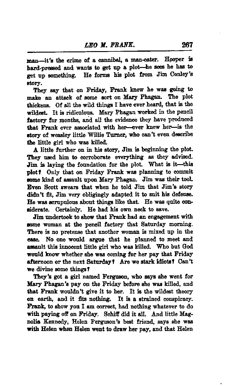 They say that on Friday, Frank knew he was going to make an attack of some sort on Mary Phagan. The plot thickens. Of all the wild things I have ever heard, that is the wildest. It is ridiculous. Mary Phagan worked in the pencil factory for months, and all the evidence they have produced that Frank ever associated with her—ever knew her—is the story of weaselly little Willie Turner, who can't even describe the little girl who was killed.