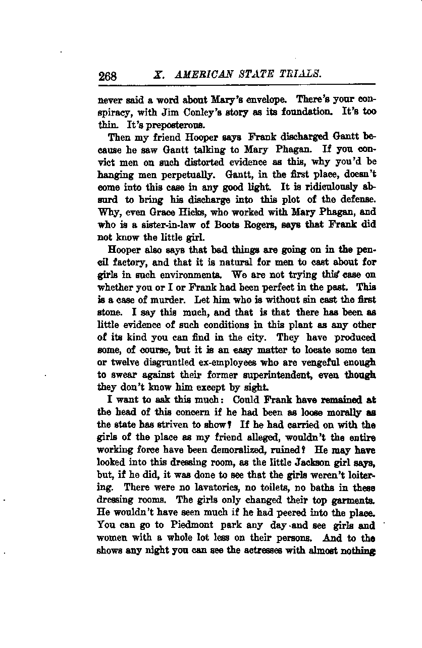 Then my friend Hooper says Frank discharged Gantt because he saw Gantt talking to Mary Phagan. If you convict men on such distorted evidence as this, you'd be hanging men perpetually. Gantt, in the first place, doesn't come into this case in any good light. It is ridiculously absurd to bring his discharge into this plot of the defense. Why, even Grace Hicks, who worked with Mary Phagan, and who is a sister-in-law of Boots Rogers, says that Frank did not know the little girl.