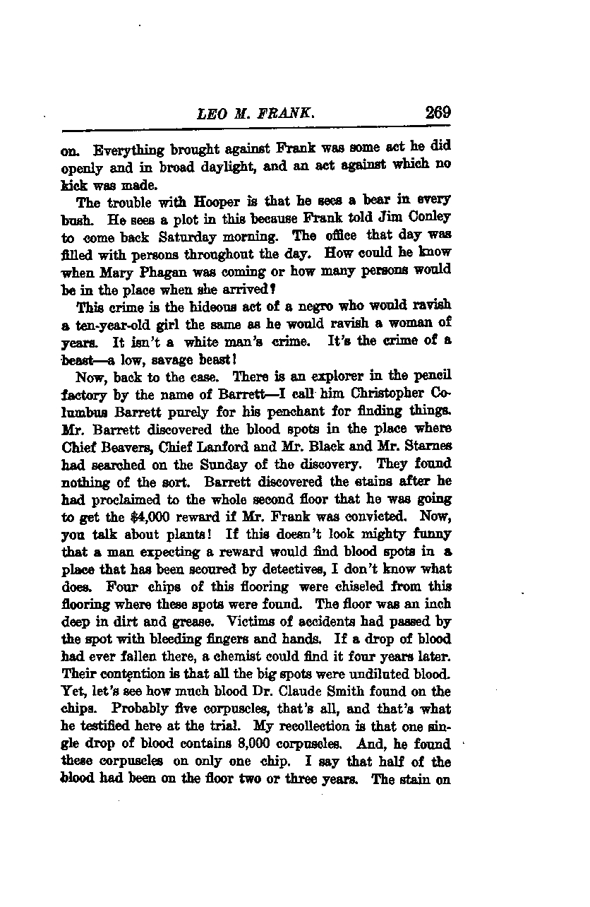 Now, back to the case. There is an explorer in the pencil factory by the name of Barrett—I call him Christopher Columbus Barrett purely for his penchant for finding things. Mr. Barrett discovered the blood spots in the place where Chief Beavers, Chief Lanford, and Mr. Black and Mr. Starnes had searched on the Sunday of the discovery. They found nothing of the sort. Barrett discovered the stains after he had proclaimed to the whole second floor that he was going to get the $4,000 reward if Mr. Frank was convicted. Now, you talk about plants! If this doesn’t look mighty funny that a man expecting a reward would find blood spots in a place that has been scoured by detectives, I don’t know what does. Four chips of this flooring were chiseled from this flooring where these spots were found. The floor was an inch deep in dirt and grease. Victims of accidents had passed by the spot with bleeding fingers and hands. If a drop of blood had ever fallen there, a chemist could find it four years later. Their contention is that all the big spots were undiluted blood. Yet, let’s see how much blood Dr. Claude Smith found on the chips. Probably five corpuscles, that’s all, and that’s what he testified here at the trial. My recollection is that a single drop of blood contains 8,000 corpuscles. And, he found these corpuscles on only one chip. I say that half of the blood had been on the floor two or three years. The stain on the floor was not fresh.