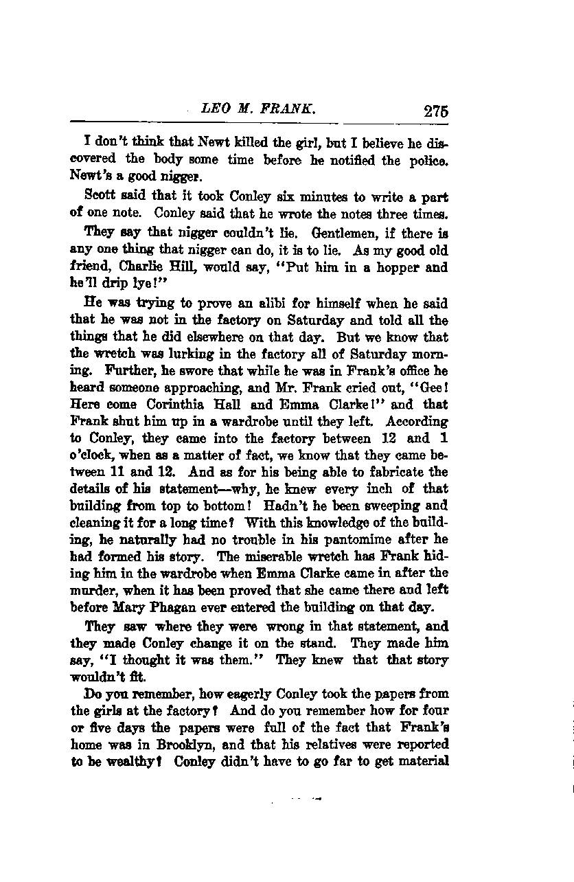 He was trying to prove an alibi for himself when he said that he was not in the factory on Saturday and told all the things that he did elsewhere on that day. But we know that the wretch was lurking in the factory all of Saturday morning. Further, he swore that while he was in Frank's office, he heard someone approaching, and Mr. Frank cried out, "Gee! Here come Corinthia Hall and Emma Clarke!" and that Frank shut him up in a wardrobe until they left. According to Conley, they came into the factory between 12 and 1 o'clock, when as a matter of fact, we know that they came between 11 and 12. And as for his being able to fabricate the details of his statement—why, he knew every inch of that building from top to bottom! Hadn't he been sweeping and cleaning it for a long time? With this knowledge of the building, he naturally had no trouble in his pantomime after he had formed his story. The miserable wretch has Frank hiding him in the wardrobe when Emma Clarke came in after the murder, when it has been proved that she came there and left before Mary Phagan ever entered the building on that day.