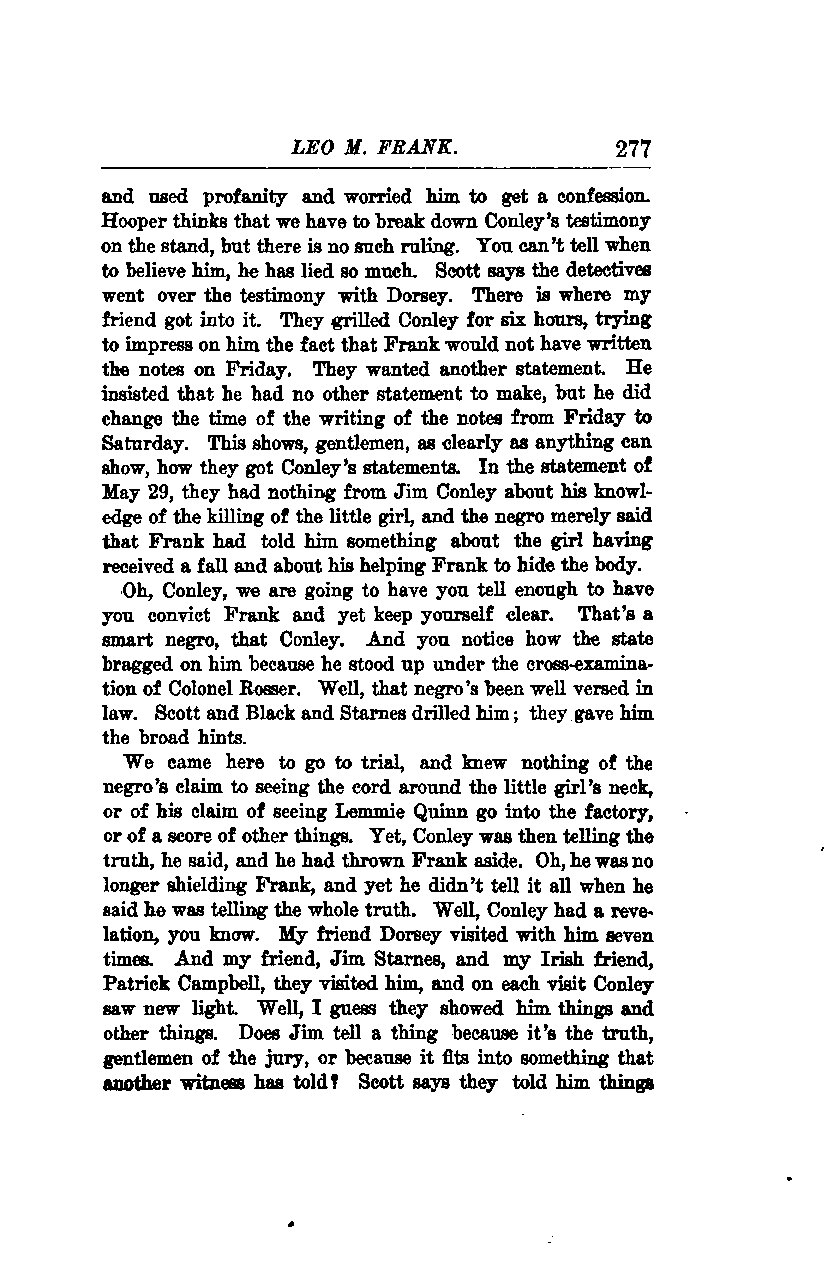 The prosecution used profanity and worried him to get a confession. Hooper thinks that we have to break down Conley's testimony on the stand, but there is no such ruling. You can't tell when to believe him; he has lied so much. Scott says the detectives went over the testimony with Dorsey. That's where my friend got into it. They grilled Conley for six hours, trying to impress on him the fact that Frank would not have written the notes on Friday. They wanted another statement. He insisted that he had no other statement to make, but he did change the time of the writing of the notes from Friday to Saturday. This shows, gentlemen, as clearly as anything can show, how they got Conley's statements. In the statement of May 29, they had nothing from Jim Conley about his knowledge of the killing of the little girl, and the negro merely said that Frank had told him something about the girl having received a fall and about his helping Frank to hide the body.