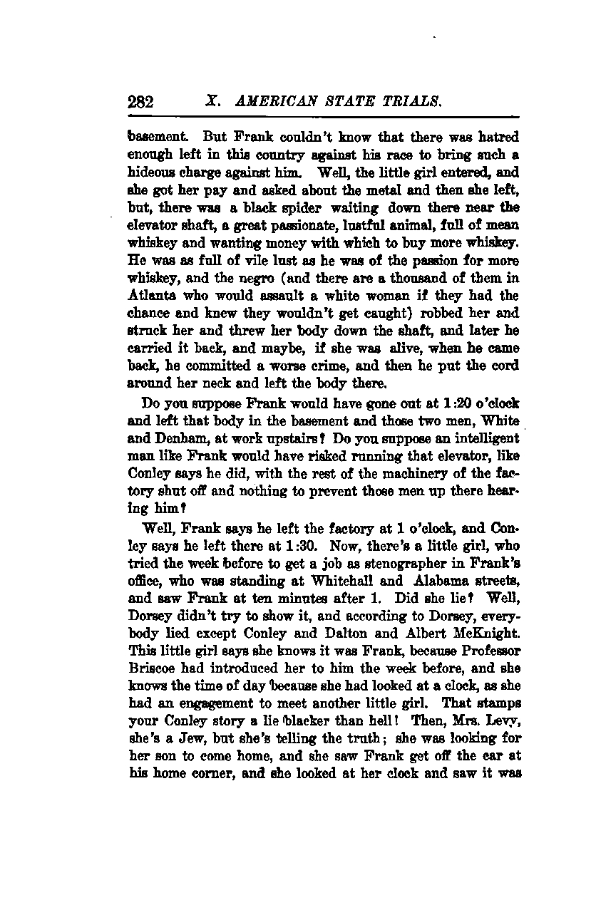 Frank couldn't have known that there was enough hatred left in this country against his race to bring such a hideous charge against him. The little girl entered the factory, received her pay, inquired about the metal, and then left. However, there was a black spider waiting down there near the elevator shaft—a great, passionate, lustful animal, full of cheap whiskey and wanting money to buy more. He was as full of vile lust as he was of the passion for more whiskey. The negro (and there are a thousand of them in Atlanta who would assault a white woman if they had the chance and knew they wouldn’t get caught) robbed her, struck her, threw her body down the shaft, and later carried it back. Perhaps, if she was still alive when he returned, he committed an even worse crime. Then, he put the cord around her neck and left the body there.
