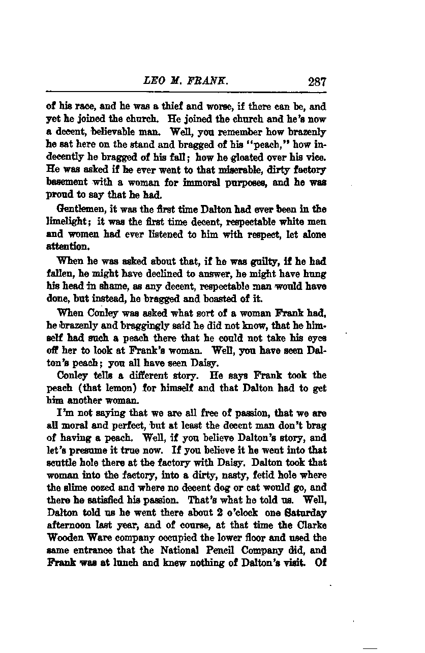 I'm not saying that we are all free of passion, that we are all moral and perfect, but at least the decent man doesn't brag of having a peach. Well, if you believe Dalton's story, and let's presume it true now. If you believe it, he went into that scuttle hole there at the factory with Daisy. Dalton took that woman into the factory, into a dirty, nasty, fetid hole where the slime oozed and where no decent dog or cat would go, and there he satisfied his passion. That's what he told us. Well, Dalton told us he went there about 2 o'clock one Saturday afternoon last year, and of course, at that time the Clarke Wooden Ware company occupied the lower floor and used the same entrance that the National Pencil Company did, and Frank was at lunch and knew nothing of Dalton's visit.