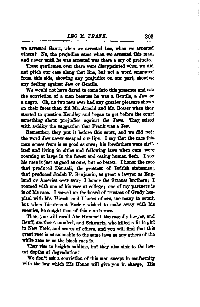Remember, they put it before this court, and we did not; the word Jew never escaped our lips. I say that the race this man comes from is as good as ours; his forefathers were civilized and living in cities and following laws when ours were roaming at large in the forest and eating human flesh. I say his race is just as good as ours, but no better. I honor the race that produced Disraeli, the greatest of British statesmen; that produced Judah P. Benjamin, as great a lawyer as England or America ever saw; I honor the Strauss brothers; I roomed with one of his race at college; one of my partners is of his race. I served on the board of trustees of Grady Hospital with Mr. Hirsch, and I know others, too many to count, but when Lieutenant Becker wished to make away with his enemies, he sought men of this man's race.