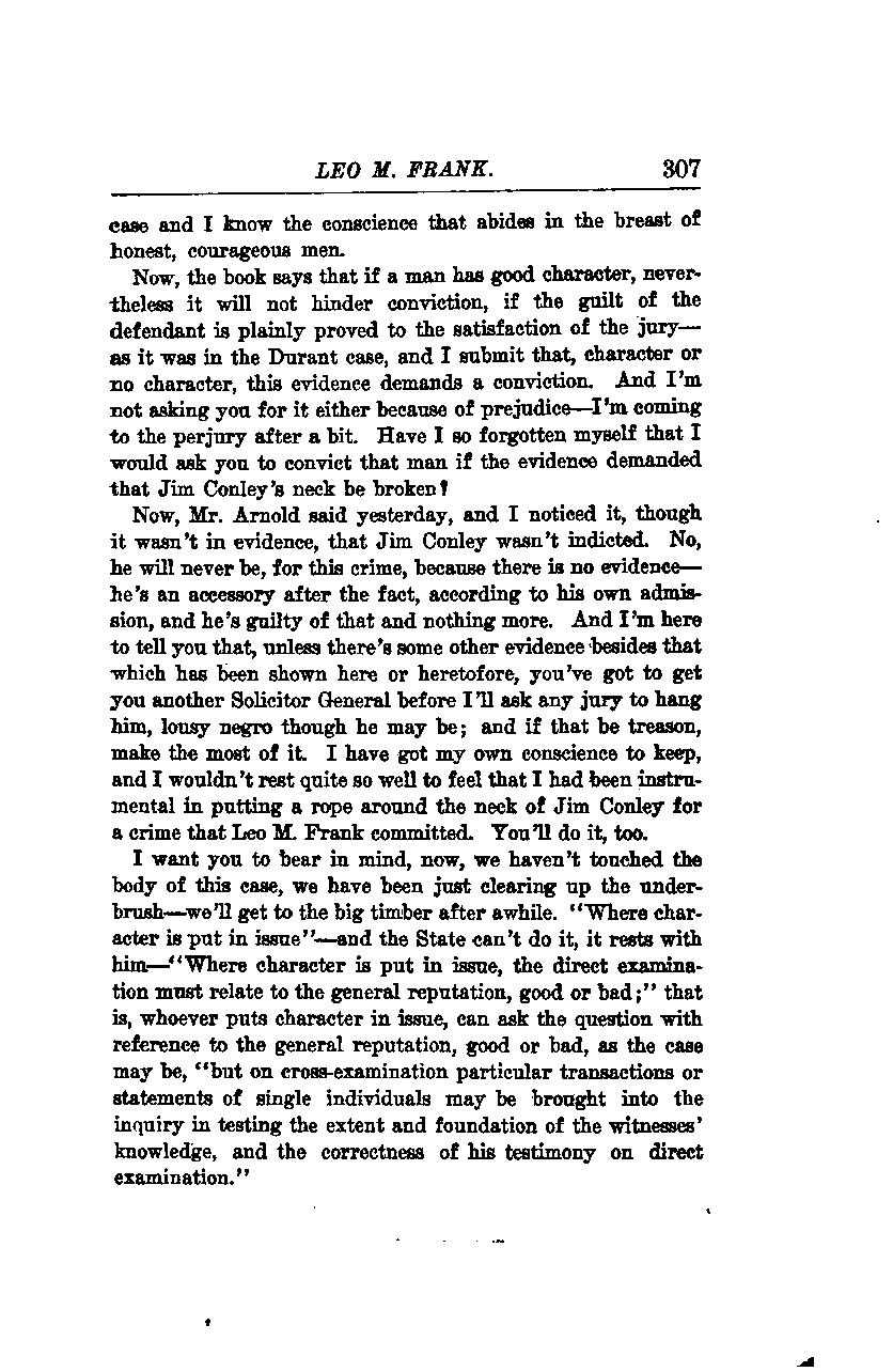 Now, Mr. Arnold said yesterday, and I noticed it, though it wasn't in evidence, that Jim Conley wasn't indicted. No, he will never be, for this crime, because there is no evidence—he's an accessory after the fact, according to his own admission, and he's guilty of that and nothing more. And I'm here to tell you that, unless there's some other evidence besides that which has been shown here or heretofore, you've got to get yourself another Solicitor General before I'll ask any jury to hang him, lousy negro though he may be; and if that be treason, make the most of it. I have got my own conscience to keep, and I wouldn't rest quite so well to feel that I had been instrumental in putting a rope around the neck of Jim Conley for a crime that Leo M. Frank committed. You'll do it, too.