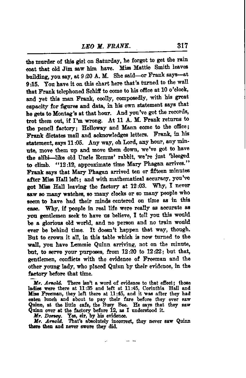 On the day of the murder of this girl on Saturday, he forgot to get the raincoat that old Jim saw him have. Miss Mattie Smith leaves the building, you say, at 9:20 A.M. She said—or Frank says—at 9:15. You have it on this chart here that's turned to the wall that Frank telephoned Schiff to come to his office at 10 o'clock, and yet this man Frank, coolly, composedly, with his great capacity for figures and data, in his own statement says that he gets to Montag's at that hour. And you've got the records, trot them out, if I'm wrong. At 11 A.M., Frank returns to the pencil factory; Holloway and Mann come to the office; Frank dictates mail and acknowledges letters. Frank, in his statement, says 11:05. Any way, oh Lord, any hour, any minute, move them up and move them down, we've got to have the alibi—like old Uncle Remus' rabbit, we're just 'bleeged to climb. "12:12, approximate time Mary Phagan arrives." Frank says that Mary Phagan arrived ten or fifteen minutes after Miss Hall left; and with mathematical accuracy, you've got Miss Hall leaving the factory at 12:03. Why, I never saw so many watches, so many clocks, or so many people who seem to have had their minds centered on time as in this case. Why, if people in real life were really as accurate as you gentlemen seek to have us believe, I tell you this would be a glorious old world, and no person and no train would ever be behind time. It doesn't happen that way, though. But to crown it all, in this table which is now turned to the wall, you have Lemmie Quinn arriving, not on the minute, at, to serve your purposes, from 12:20 to 12:22; but that, gentlemen, conflicts with the evidence of Freeman and the other young lady, who placed Quinn by their evidence, in the factory before that time.