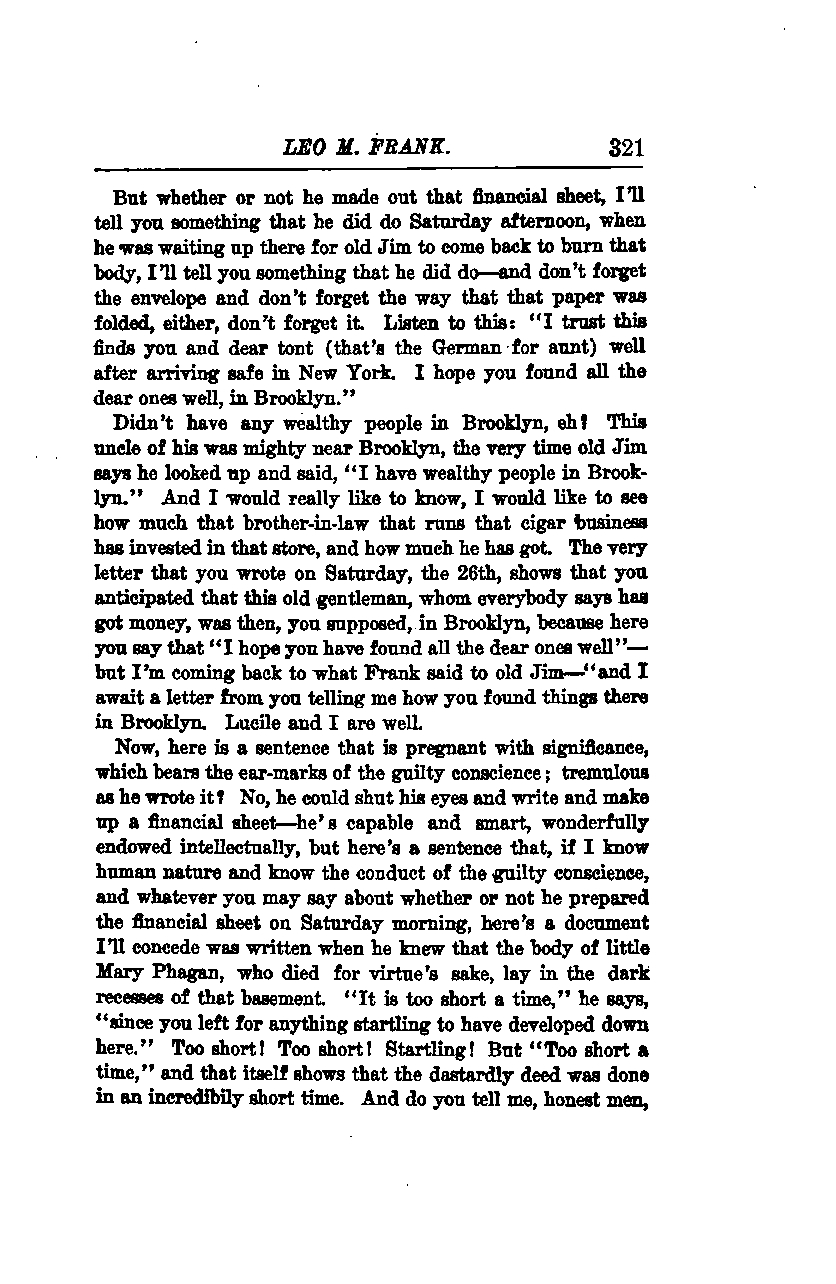 Now, here is a sentence that is pregnant with significance, which bears the earmarks of the guilty conscience; tremulous as he wrote it? No, he could shut his eyes and write and make up a financial sheet—he's capable and smart, wonderfully endowed intellectually, but here's a sentence that, if I know human nature and know the conduct of the guilty conscience, and whatever you may say about whether or not he prepared the financial sheet on Saturday morning, here's a document I'll concede was written when he knew that the body of little Mary Phagan, who died for virtue's sake, lay in the dark recesses of that basement. "It is too short a time," he says, "since you left for anything startling to have developed down here." Too short! Too short! Startling! But "Too short a time," and that itself shows that the dastardly deed was done in an incredibly short time. And do you tell me, honest men,