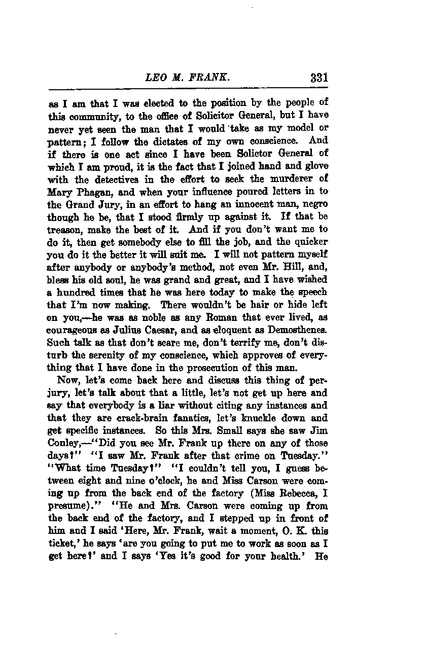 Now, let’s come back here and discuss this thing of perjury. Let’s talk about that a little; let’s not get up here and say that everybody is a liar without citing any instances and that they are crack-brain fanatics. Let’s knuckle down and get specific instances. So, this Mrs. Small says she saw Jim Conley. "Did you see Mr. Frank up there on any of those days?" "I saw Mr. Frank after that crime on Tuesday." "What time Tuesday?" "I couldn’t tell you, I guess between eight and nine o’clock. He and Miss Carson were coming up from the back end of the factory (Miss Rebecca, I presume)." "He and Mrs. Carson were coming up from the back end of the factory, and I stepped up in front of him and I said, 'Here, Mr. Frank, wait a moment, O.K. this ticket.' He says, 'Are you going to put me to work as soon as I get here?' and I says, 'Yes, it’s good for your health.' He..."