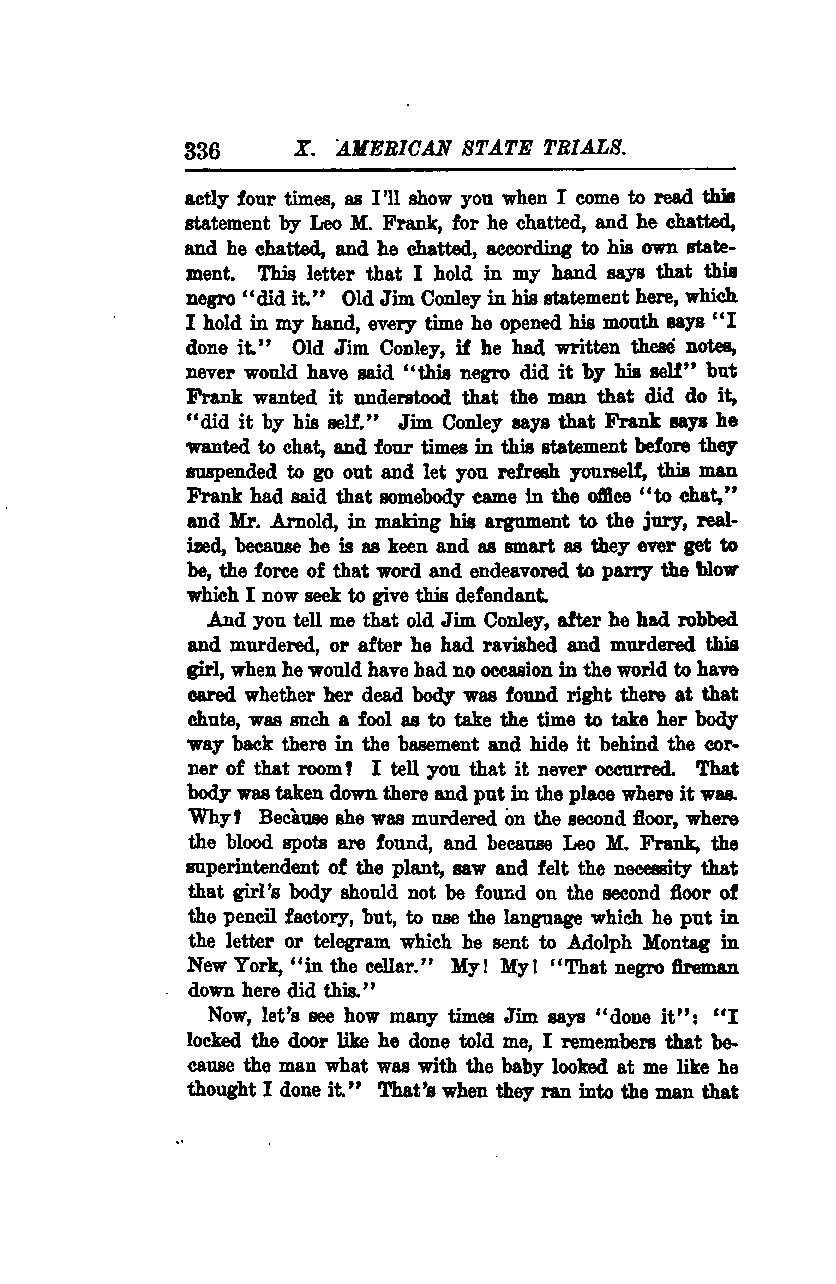 Exactly four times, as I'll show you when I come to read this statement by Leo M. Frank, for he chatted, and he chatted, and he chatted, and he chatted, according to his own statement. This letter that I hold in my hand says that this negro "did it." Old Jim Conley in his statement here, which I hold in my hand, every time he opened his mouth says "I done it." Old Jim Conley, if he had written these notes, never would have said "this negro did it by his self," but Frank wanted it understood that the man that did do it, "did it by his self." Jim Conley says that Frank says he wanted to chat, and four times in this statement before they suspended to go out and let you refresh yourself, this man Frank had said that somebody came in the offices "to chat," and Mr. Arnold, in making his argument to the jury, realized, because he is as keen and as smart as they ever get to be, the force of that word and endeavored to parry the blow which I now seek to give this defendant.