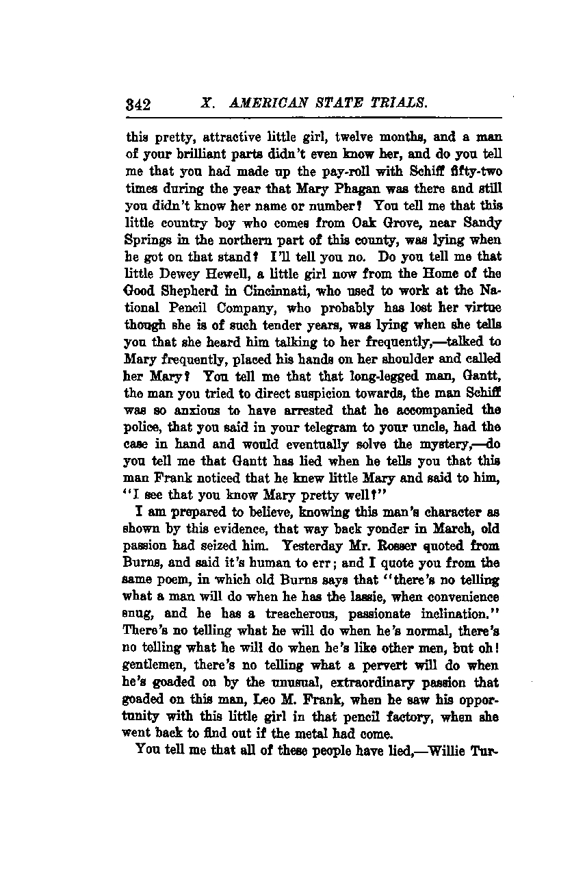 This pretty, attractive little girl, twelve months, and a man of your brilliant parts didn't even know her, and do you tell me that you had made up the pay-roll with Schiff fifty-two times during the year that Mary Phagan was there and still you didn't know her name or number? You tell me that this little country boy who comes from Oak Grove, near Sandy Springs in the northern part of this county, was lying when he got on that stand? I'll tell you no. Do you tell me that little Dewey Hewell, a little girl now from the Home of the Good Shepherd in Cincinnati, who used to work at the National Pencil Company, who probably has lost her virtue though she is of such tender years, was lying when she tells you that she heard him talking to her frequently—talked to Mary frequently, placed his hands on her shoulder and called her Mary? You tell me that that long-legged man, Gantt, the man you tried to direct suspicion towards, the man Schiff was so anxious to have arrested that he accompanied the police, that you said in your telegram to your uncle, had the case in hand and would eventually solve the mystery—do you tell me that Gantt has lied when he tells you that this man Frank noticed that he knew little Mary and said to him, "I see that you know Mary pretty well"?