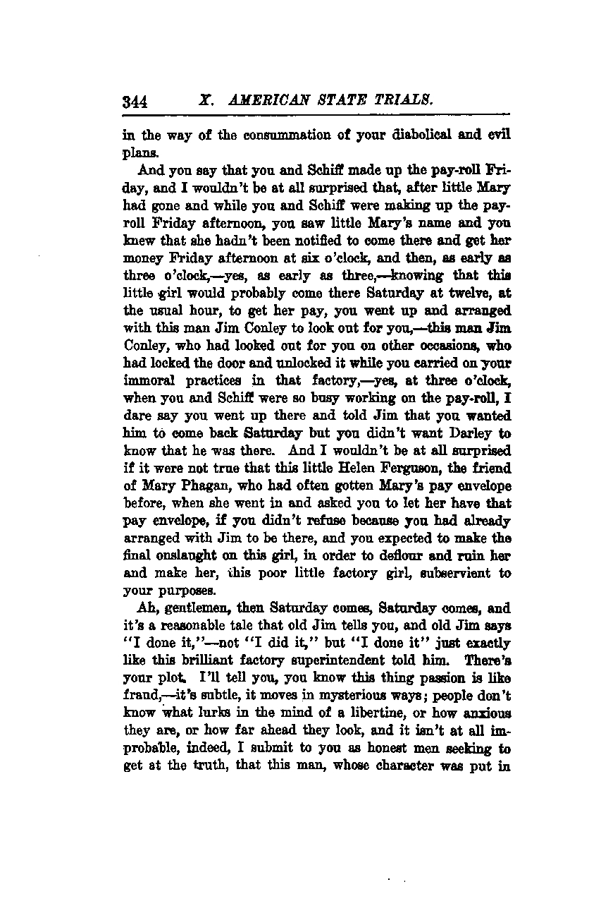 Ah, gentlemen, then Saturday comes, Saturday comes, and it's a reasonable tale that old Jim tells you, and old Jim says, "I done it"—not "I did it," but "I done it," just exactly like this brilliant factory superintendent told him. There's your plot. I'll tell you, you know this thing passion is like fraud—it's subtle, it moves in mysterious ways; people don't know what lurks in the mind of a libertine, or how anxious they are, or how far ahead they look, and it isn't at all improbable, indeed, I submit to you as honest men seeking to get at the truth, that this man, whose character was put in...