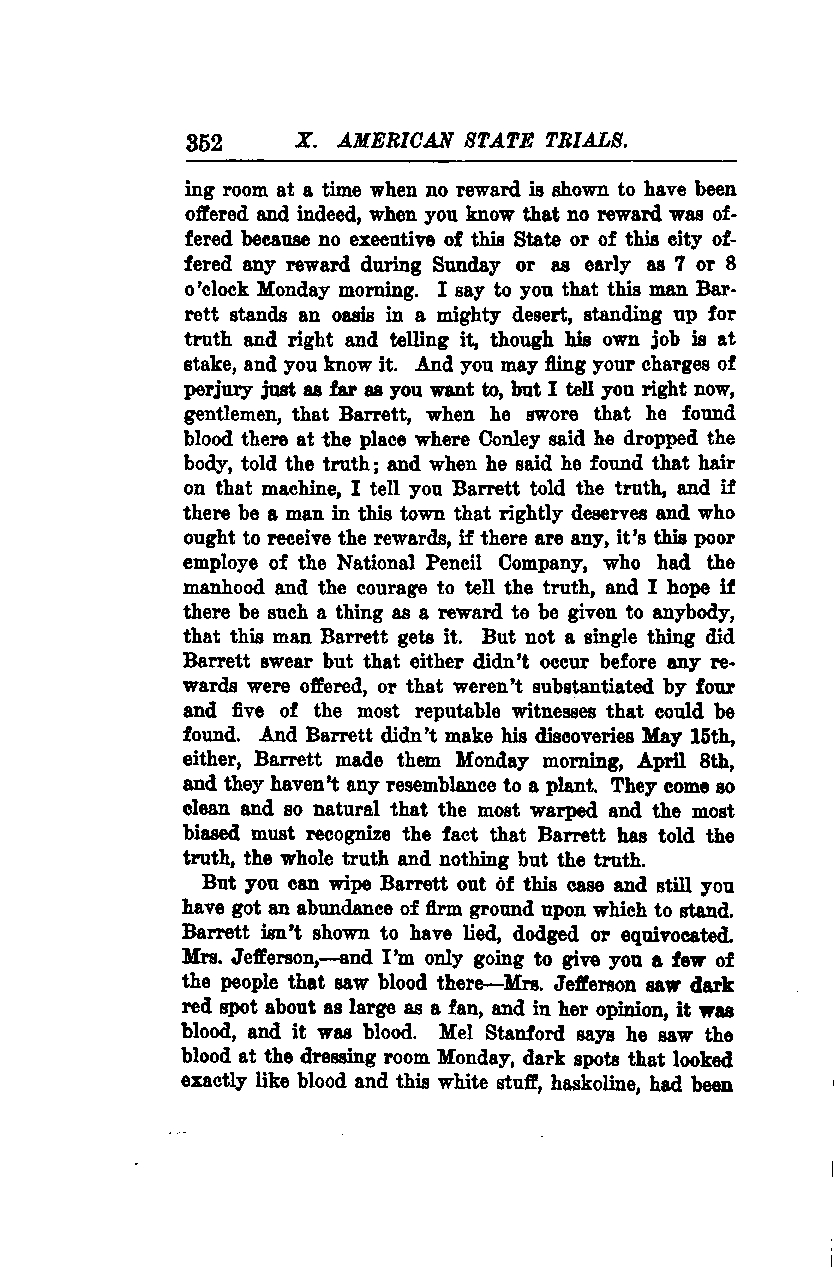 In the dressing room at a time when no reward is shown to have been offered—and indeed, when you know that no reward was offered because no executive of this state or of this city offered any reward during Sunday or as early as 7 or 8 o'clock Monday morning—I say to you that this man Barrett stands as an oasis in a mighty desert, standing up for truth and right and telling it, though his own job is at stake, and you know it. And you may fling your charges of perjury just as far as you want to, but I tell you right now, gentlemen, that Barrett, when he swore that he found blood there at the place where Conley said he dropped the body, told the truth; and when he said he found that hair on that machine, I tell you Barrett told the truth. If there be a man in this town that rightly deserves and who ought to receive the rewards, if there are any, it's this poor employee of the National Pencil Company, who had the manhood and the courage to tell the truth. I hope if there be such a thing as a reward to be given to anybody, that this man Barrett gets it. But not a single thing did Barrett swear to that either didn't occur before any rewards were offered, or that weren't substantiated by four and five of the most reputable witnesses that could be found. And Barrett didn't make his discoveries on May 15th, either; Barrett made them Monday morning, April 8th, and they haven't any resemblance to a plant. They come so clean and so natural that the most warped and the most biased must recognize the fact that Barrett has told the truth, the whole truth, and nothing but the truth.