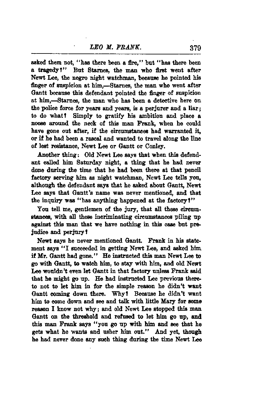 When the incident occurred, the first question asked was not, "Has there been a fire?" but "Has there been a tragedy?" Starnes, the man who initially suspected Newt Lee, the negro night watchman, because he pointed his finger of suspicion at him, and who later went after Gantt because this defendant pointed the finger of suspicion at him, is a perjurer and a liar. Starnes, who has been a detective on the police force for many years, did this simply to gratify his ambition and place a noose around the neck of this man, Frank. He could have gone after Newt Lee or Gantt or Conley if the circumstances had warranted it, or if he had been a rascal and wanted to travel along the line of least resistance.