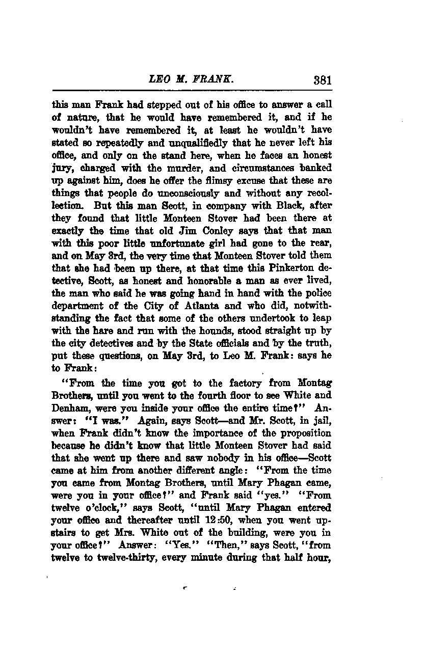 But this man Scott, in company with Black, after they found that little Monteen Stover had been there at exactly the time that old Jim Conley says that man with this poor little unfortunate girl had gone to the rear, and on May 3rd, the very time that Monteen Stover told them that she had been up there, at that time this Pinkerton detective, Scott, an honest and honorable man as ever lived, the man who said he was going hand in hand with the police department of the City of Atlanta and who did, notwithstanding the fact that some of the others undertook to leap with the hare and run with the hounds, stood straight up by the city detectives and by the State officials and by the truth, put these questions, on May 3rd, to Leo M. Frank. He said to Frank: