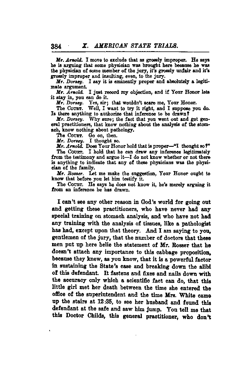 I can't see any other reason in God's world for going out and getting these practitioners, who have never had any special training on stomach analysis, and who have not had any training with the analysis of tissues, like a pathologist has had, except upon that theory. And I am saying to you, gentlemen of the jury, that the number of doctors that these men put up here belie the statement of Mr. Rosser that he doesn't attach any importance to this cabbage proposition, because they knew, as you know, that it is a powerful factor in sustaining the State's case and breaking down the alibi of this defendant. It fastens and fixes and nails down with the accuracy only which a scientific fact can do, that this little girl met her death between the time she entered the office of the superintendent and the time Mrs. White came up the stairs at 12:35, to see her husband and found this defendant at the safe and saw him jump. You tell me that this Doctor Childs, this general practitioner, who doesn't...