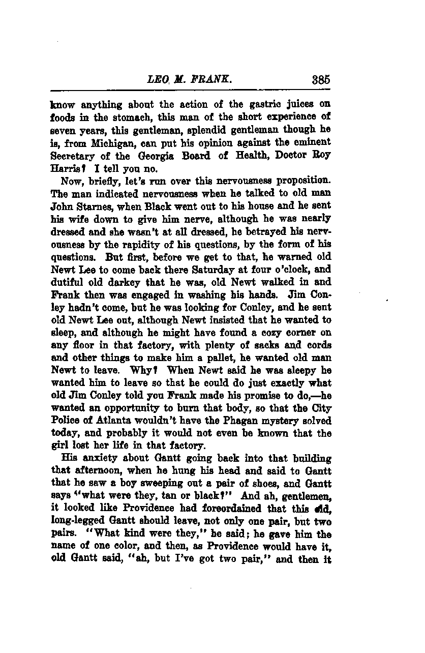 Now, let's briefly review this nervousness proposition. The man displayed nervousness when he talked to old man John Starnes. When Black went out to his house and he sent his wife down to give him nerve, although he was nearly dressed and she wasn't at all, he betrayed his nervousness by the rapidity of his questions and by the form of his questions. But first, before we get to that, he warned old Newt Lee to come back there Saturday at four o'clock. Dutiful old darkey that he was, old Newt walked in, and Frank was then engaged in washing his hands. Jim Conley hadn't come, but he was looking for Conley, and he sent old Newt Lee out, although Newt insisted that he wanted to sleep. Although he might have found a cozy corner on any floor in that factory, with plenty of sacks and cords and other things to make him a pallet, he wanted old man Newt to leave. Why? When Newt said he was sleepy, he wanted him to leave so that he could do just exactly what old Jim Conley told you Frank made his promise to do—he wanted an opportunity to burn that body, so that the City Police of Atlanta wouldn't have the Phagan mystery solved today, and probably it would not even be known that the girl lost her life in that factory.
