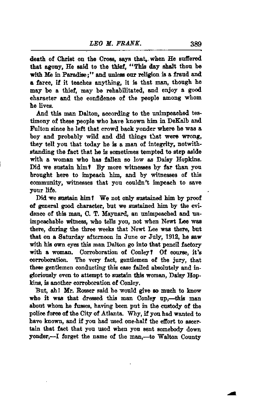 Did we sustain him? We not only sustained him by proof of general good character, but we sustained him by the evidence of this man, C. T. Maynard, an unimpeached and unimpeachable witness, who tells you, not when Newt Lee was there, during the three weeks that Newt Lee was there, but that on a Saturday afternoon in June or July, 1912, he saw with his own eyes this man Dalton go into that pencil factory with a woman. Corroboration of Conley? Of course, it's corroboration. The very fact, gentlemen of the jury, that these gentlemen conducting this case failed absolutely and ingloriously even to attempt to sustain this woman, Daisy Hopkins, is another corroboration of Conley.