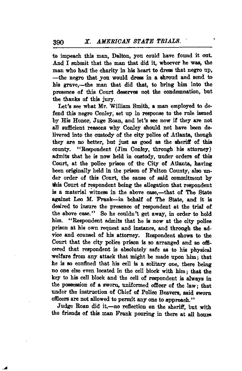 Let's see what Mr. William Smith, a man employed to defend this negro Conley, set up in response to the rule issued by His Honor, Judge Roan, and let's see now if they are not all sufficient reasons why Conley should not have been delivered into the custody of the city police of Atlanta, though they are no better, but just as good as the sheriff of this county. "Respondent (Jim Conley, through his attorney) admits that he is now held in custody, under orders of this Court, at the police prison of the City of Atlanta, having been originally held in the prison of Fulton County, also under order of this Court, the cause of said commitment by this Court of respondent being the allegation that respondent is a material witness in the above case—that of The State against Leo M. Frank—in behalf of The State, and it is desired to insure the presence of respondent at the trial of the above case." So he couldn't get away, in order to hold him, "Respondent admits that he is now at the city police prison at his own request and instance, and through the advice and counsel of his attorney. Respondent shows to the Court that the city police prison is so arranged and so officered that respondent is absolutely safe as to his physical welfare from any attack that might be made upon him; that he is so confined that his cell is a solitary one, there being no one else even located in the cell block with him; that the key to his cell block and the cell of respondent is always in the possession of a sworn, uniformed officer of the law; that under the instruction of Chief of Police Beavers, said sworn officers are not allowed to permit anyone to approach."