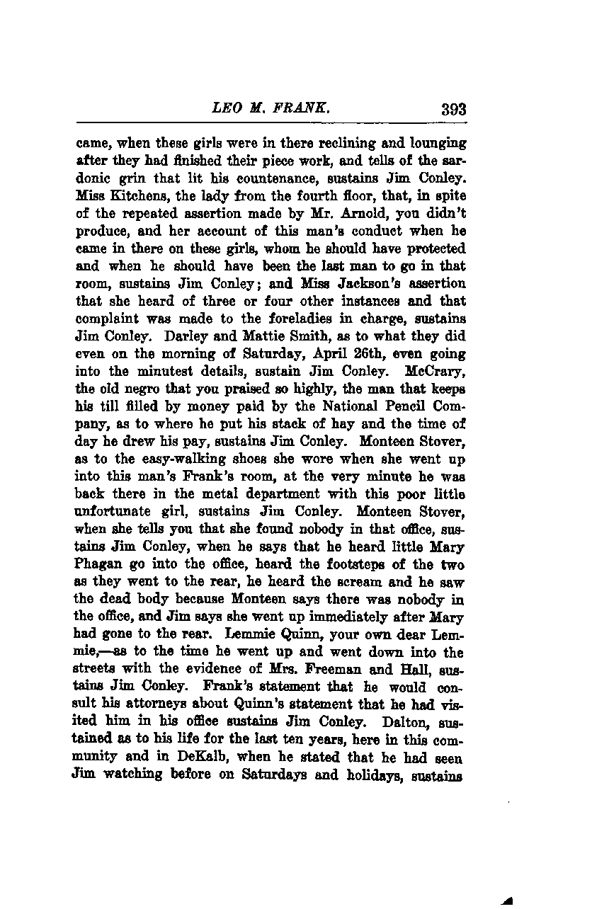 Lemmie Quinn, your own dear Lemmie, as to the time he went up and went down into the streets with the evidence of Mrs. Freeman and Hall, sustains Jim Conley. Frank's statement that he would consult his attorneys about Quinn's statement that he had visited him in his office sustains Jim Conley. Dalton, sustained as to his life for the last ten years, here in this community and in DeKalb, when he stated that he had seen Jim watching before on Saturdays and holidays, sustains Jim Conley.