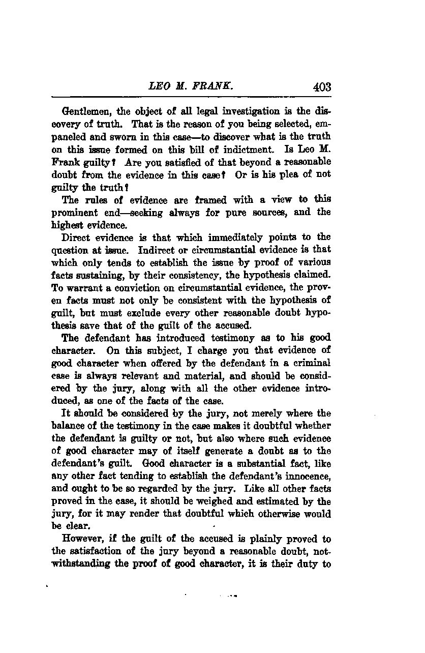 Gentlemen, the object of all legal investigation is the discovery of truth. That is the reason you have been selected, empaneled, and sworn in this case—to discover what is the truth on this issue formed on this bill of indictment. Is Leo M. Frank guilty? Are you satisfied of that beyond a reasonable doubt from the evidence in this case? Or is his plea of not guilty the truth?