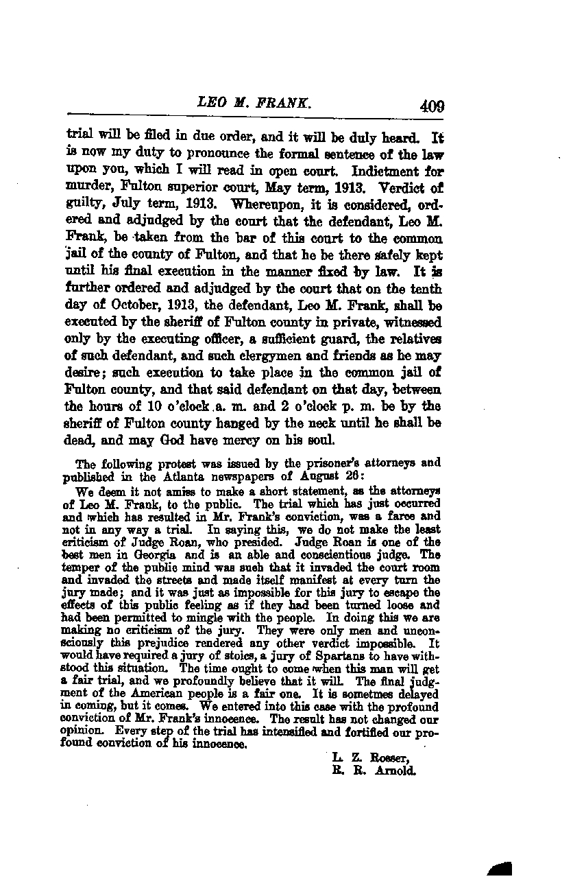 The trial will be filed in due order, and it will be duly heard. It is now my duty to pronounce the formal sentence of the law upon you, which I will read in open court. Indictment for murder, Fulton Superior Court, May term, 1913. Verdict of guilty, July term, 1913. Whereupon, it is considered, ordered, and adjudged by the court that the defendant, Leo M. Frank, be taken from the bar of this court to the common jail of the county of Fulton, and that he be there safely kept until his final execution in the manner fixed by law. It is further ordered and adjudged by the court that on the tenth day of October, 1913, the defendant, Leo M. Frank, shall be executed by the sheriff of Fulton County in private, witnessed only by the executing officer, a sufficient guard, the relatives of such defendant, and such clergymen and friends as he may desire. Such execution is to take place in the common jail of Fulton County, and that said defendant on that day, between the hours of 10 o'clock a.m. and 2 o'clock p.m., be by the sheriff of Fulton County hanged by the neck until he shall be dead, and may God have mercy on his soul.