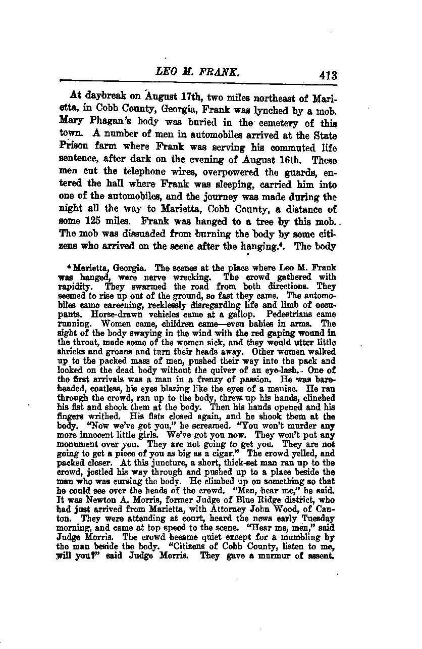 In Marietta, Georgia, the scenes at the place where Leo M. Frank was hanged were nerve-wracking. The crowd gathered with rapidity. They swarmed the road from both directions, seeming to rise up out of the ground, so fast they came. Automobiles came careening, recklessly disregarding the life and limb of occupants. Horse-drawn vehicles came at a gallop. Pedestrians came running. Women came, children came—even babies in arms. The sight of the body swaying in the wind with the red gaping wound in the throat made some of the women sick, and they would utter little shrieks and groans and turn their heads away. Other women walked up to the packed mass of men, pushed their way into the pack, and looked on the dead body without the quiver of an eyelash.