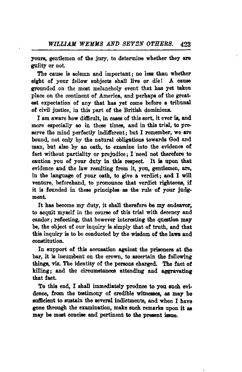 I am aware how difficult, in cases of this sort, it ever is, and more especially so in these times, and in this trial, to preserve the mind perfectly indifferent; but I remember, we are bound, not only by the natural obligations towards God and man, but also by an oath, to examine into the evidence of fact without partiality or prejudice; I need not therefore caution you of your duty in this respect. It is upon that evidence and the law resulting from it, you, gentlemen, are, in the language of your oath, to give a verdict; and I will venture, beforehand, to pronounce that verdict righteous, if it is founded in these principles: as the rule of your judgment.